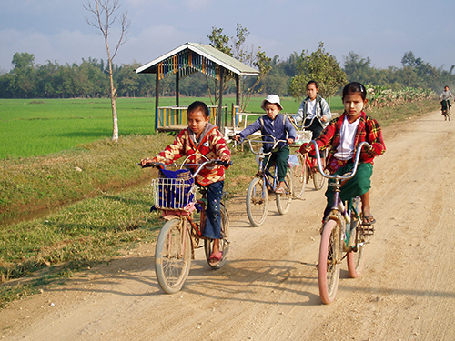 サロンを巻いて学校へ行く子供たちや市場へ向かうおばちゃん、田園に行く人たちなどが横を過ぎていく。ほとんどの人は歩くか自転車で、バイクが少しとトラクターあるだけ。