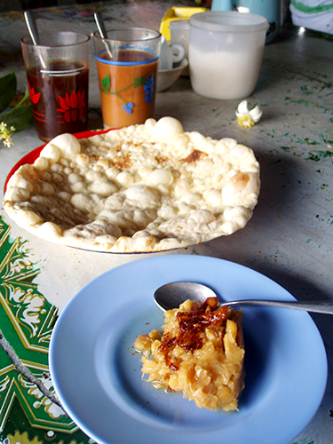 その後、バイクタクシーで中央市場へ行き、また昨日と同じ場所でナンにひよこ豆をつけて食べる。